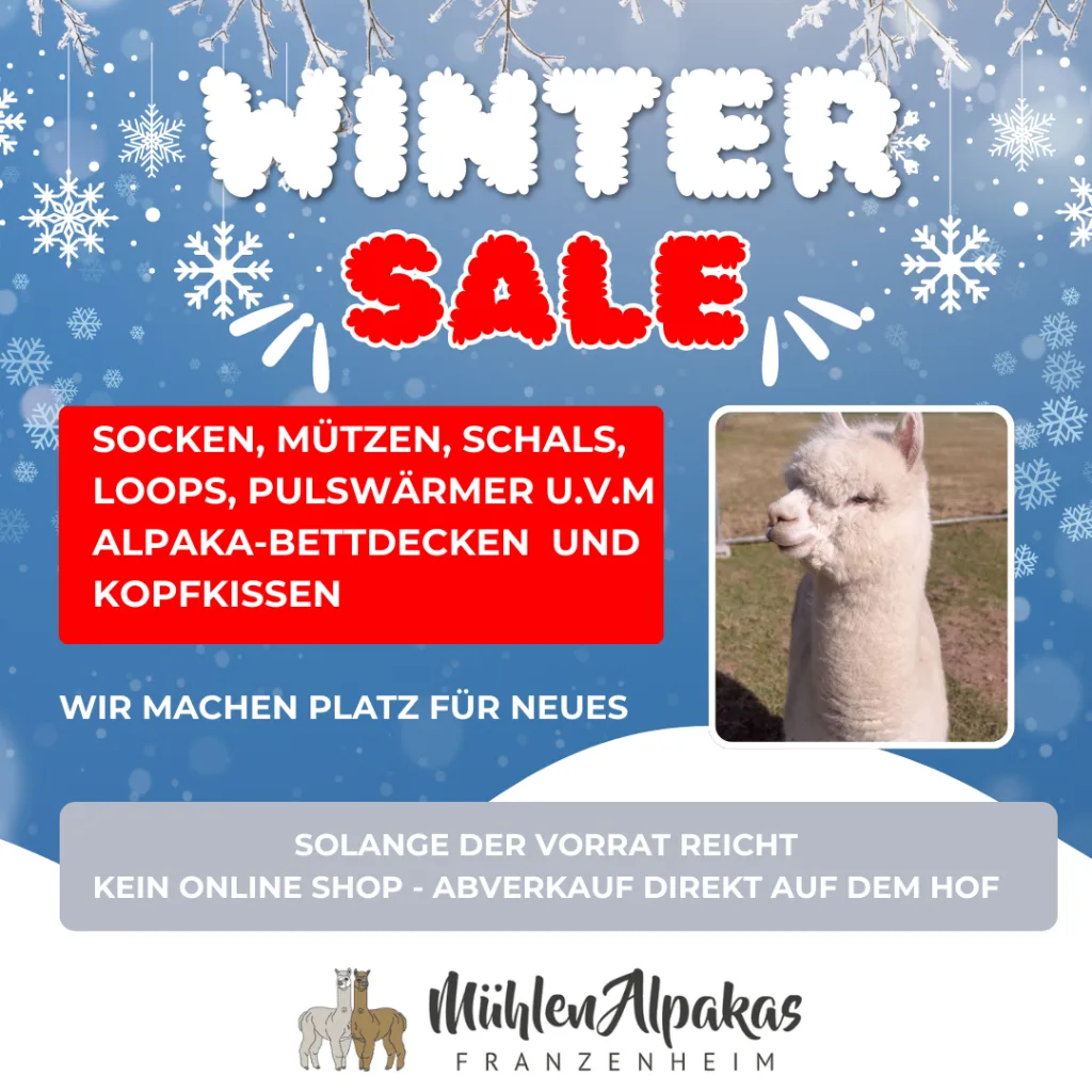Ab sofort und nur bis zum 02. Februar erhälts Du flauschige Rabatte von bis zu 40 % auf Socken, Schals, Loops, Mützen u.v.m., sowie Alpaka-Bettdecken und Kopfkissen.